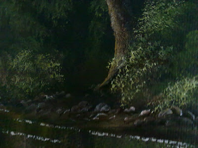 Added the shape of the trees with ultra marine and cad yellow and as i moved to the left added a bit of white to the mix. Then it was time to add some tree reflections and the far banking.